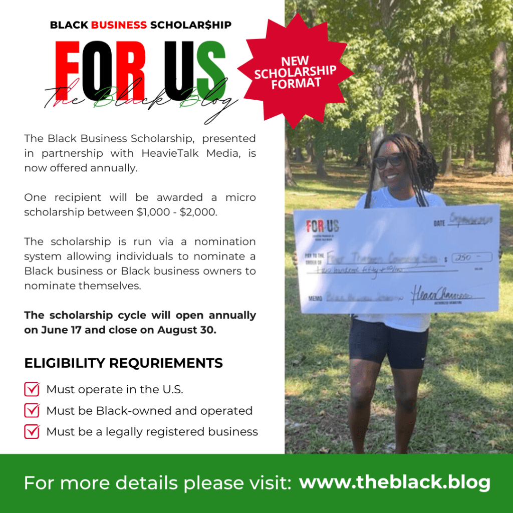 A: The Black Business Scholarship, is a scholarship presented by TheBlack.Blog and HeavieTalk Media to acknowledge Black-owned businesses in the United States that are making a positive impact in their communities.